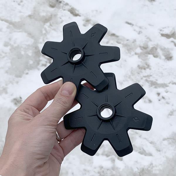 Sold as a pair. These screw on to your trekking poles for extra flotation in loose snow. No holes to catch on twigs.