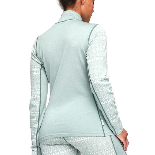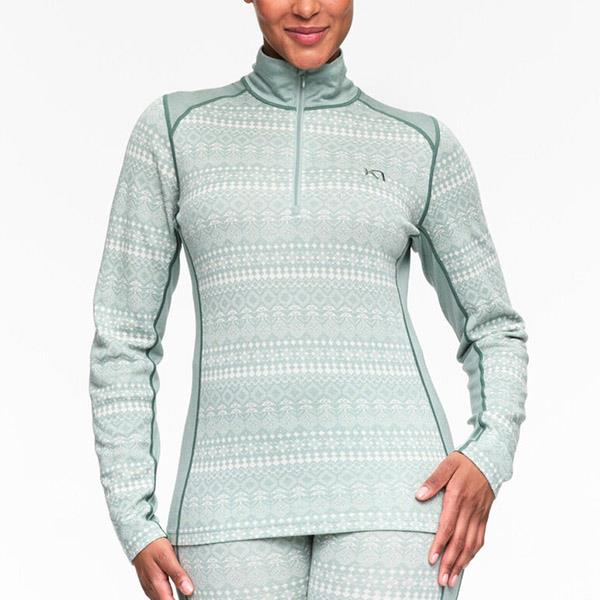 A midweight merino wool blend top with an attractive geometric floral design. It is soft and stretchy with flatlock seams for comfort.