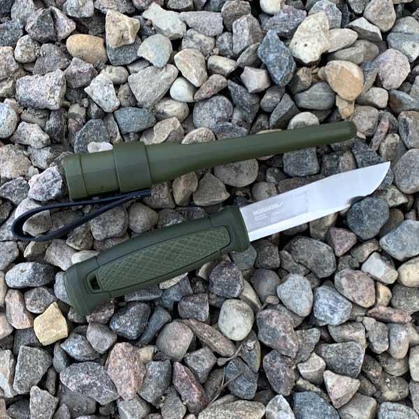 Although you can split firewood, skin an elk and start your fire with this Swedish made knife it's a lot lighter than you'd think, making it a great all-round knife for the outdoors. The blade is made of Swedish stainless steel and has a ground spine, meaning the spine corners are sharp for compatible use with a fire steel. The handle is TPE rubber for a soft friction grip making it safe and steady when using. This knife comes with a polymer sheath with belt loop.